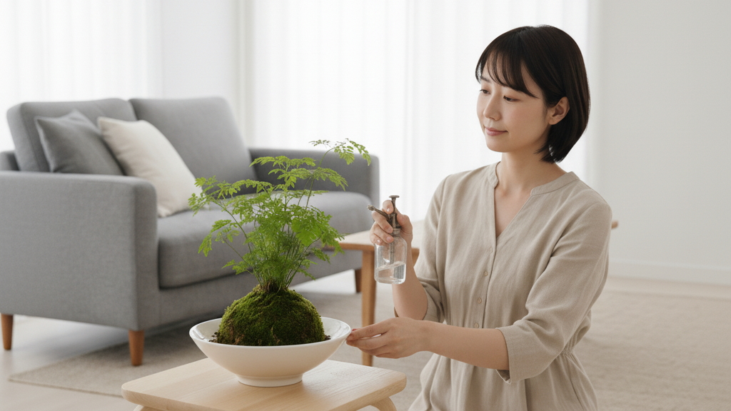 管理方法は、苔玉が軽くなったり、表面の苔が乾いてきたりしたら、水を張ったバケツなどに沈めて十分に吸水させます。気泡が出なくなるのが吸水完了のサインです。苔の乾燥を防ぐため、こまめな葉水も効果的です。