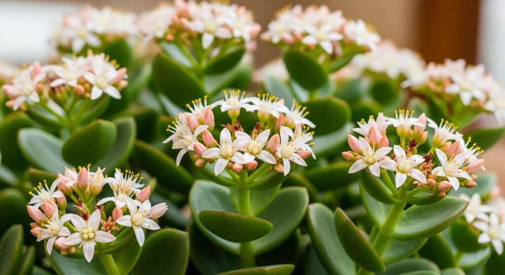 金のなる木に花が咲くことは、非常に縁起が良い「吉兆」とされています。普段は葉の美しさを楽しむ観葉植物ですが、特定の条件が揃ったときにのみ、白やピンクの星形をした可憐な花を咲かせます。