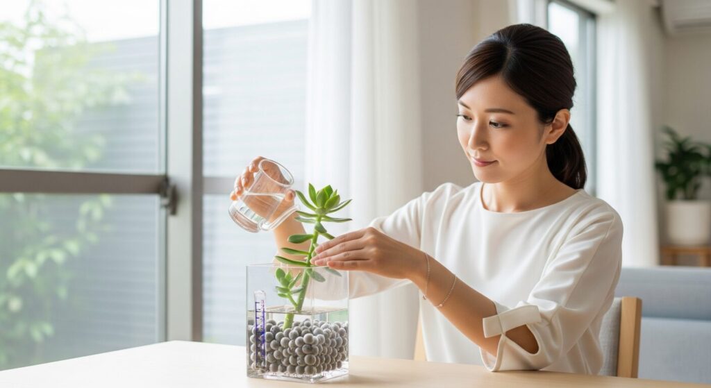 水やりの管理が最も重要なポイントです。容器の底に5分の1程度の高さまで水を入れ、その水が完全になくなってから2~3日待って、また同じ量の水を入れる、というサイクルが基本です。常に水に浸かっている状態にすると根腐れを起こしてしまうため、水を与えるタイミングを正確に守ることが大切です。透明な容器を使ったり、水位計を利用したりすると管理が容易になります。