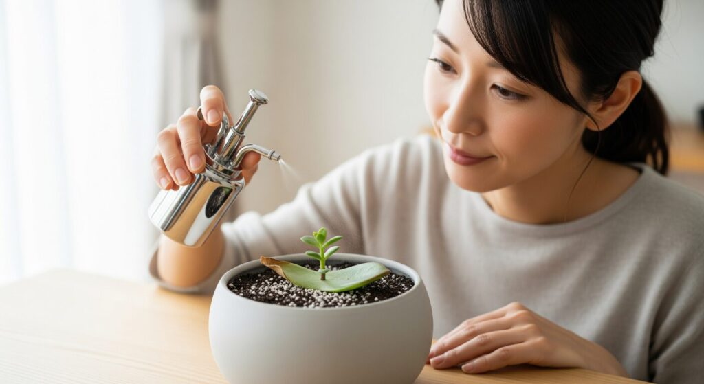 • 葉挿しで根と芽が出たら、霧吹きで水やりを開始する