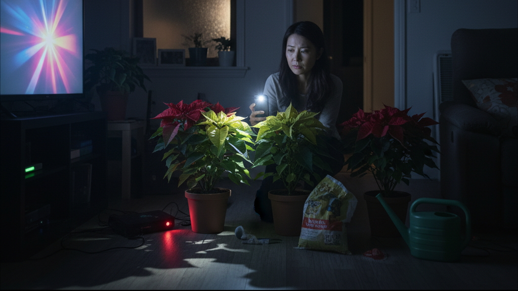 ポインセチアが赤くなるためには、前述の通り「夜」の時間が連続して12時間以上必要です。しかし、私たちが生活する室内には、夜間でも照明器具の光、テレビの画面、窓から差し込む街灯など、様々な光が存在します。たとえ人間が気にも留めないようなわずかな光であっても、ポインセチアはそれを「昼間」だと感じてしまい、花芽を作るための体内時計が何度もリセットされてしまうのです。