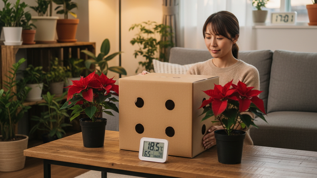 この方法を実践する際には、いくつか注意点があります。まず、箱のサイズは、ポインセチアの葉や枝を傷めたり、圧迫したりしないよう、十分な余裕のあるものを選んでください。また、箱を被せっぱなしにすると内部の湿度が上がりすぎて蒸れてしまい、病気の原因になることがあります。これを防ぐために、箱の数カ所に鉛筆などで小さな空気穴を開けておくと、空気が緩やかに対流し、健全な状態を保ちやすくなります。